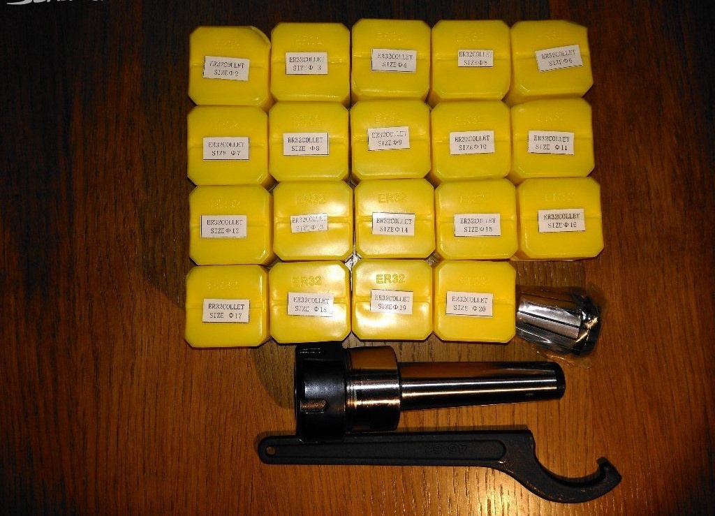 Kleštinový upínač frézka Proma + sada 19 kusů kleštin o rozměrech 2 - 20 mm, stupňováno po 1 mm. MK2, MK3, nebo MK4.