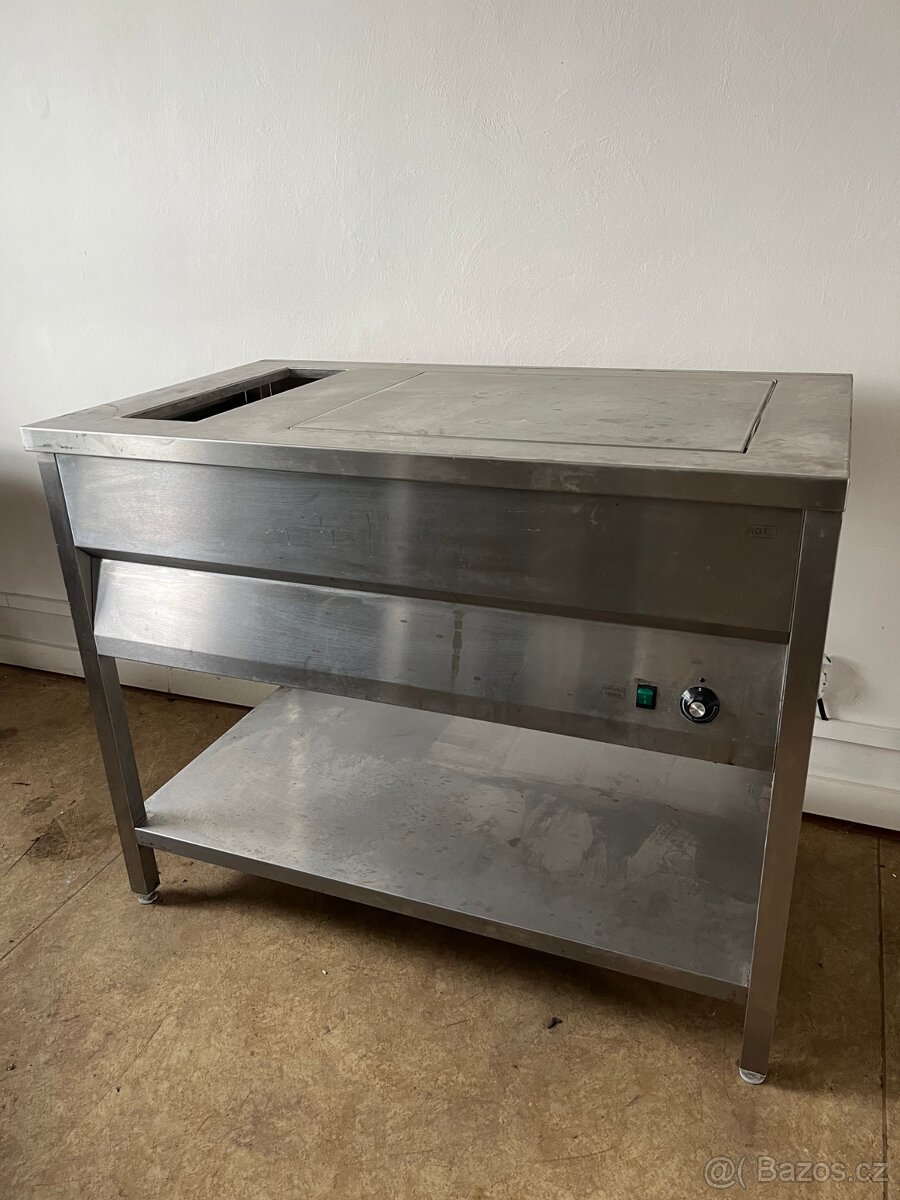 Nerezový ohřívací stůl pro nabídku teplých jídel. Rozměry: h-70cm, v-96cm, š-120cm.