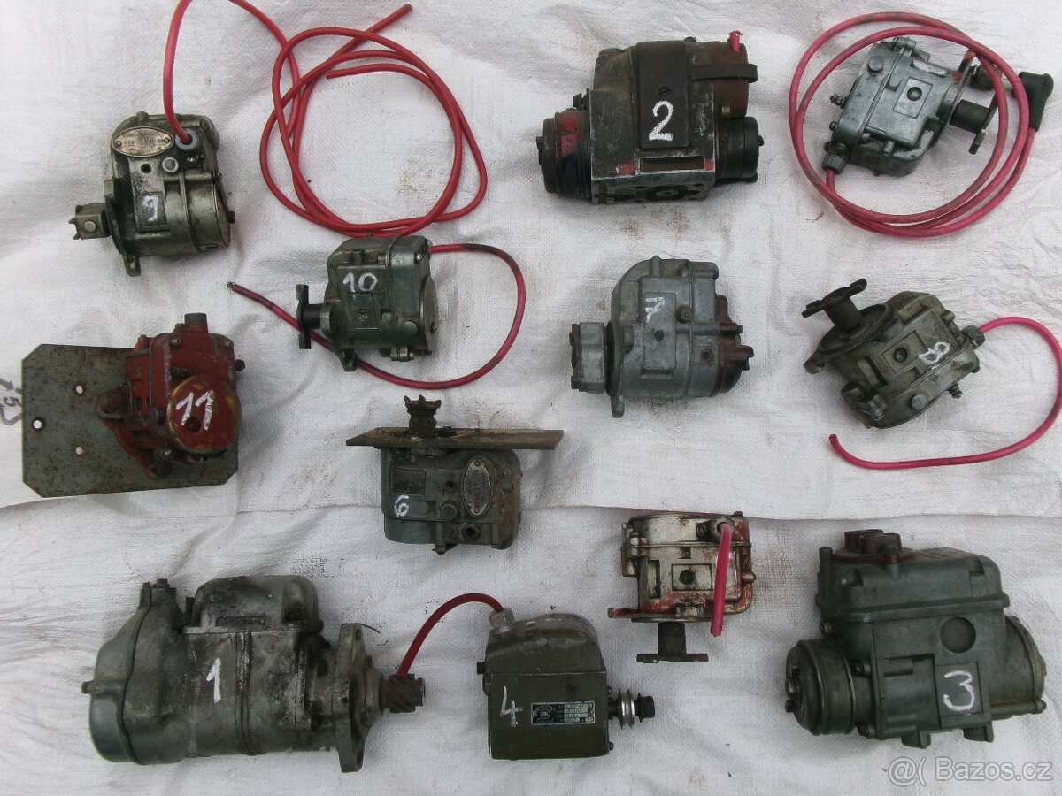 Magneto výrobce SSSR, do startovacího motoru DT-54 či 75, cena 700,-Kč. Další magneta dohodou - č.2 a 1 - předválečné, válečné 6 až 8.000,-Kč, a další. El. benzínové topení do vozidla je za 1.000,-Kč.