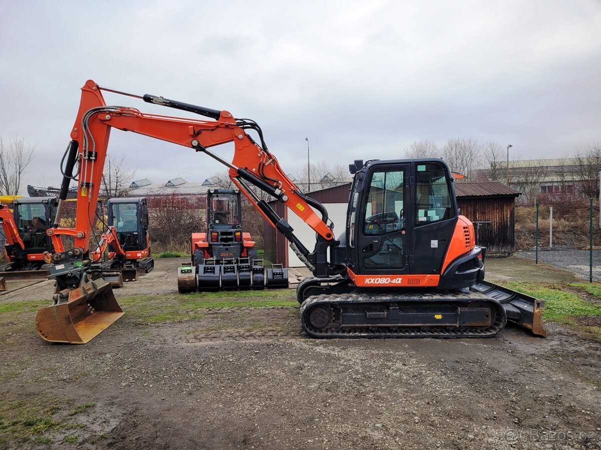 prodám minirypadlo Kubota KX080-4, r.v. 2018, skutečných 2855 Mh, hmotnost 8 800 kg, mechanický upínač Lehnhoff MS08, 1x svahovka naklápěcí (bez vůlí, stav jako nová), čerpadlo na naftu, klimatizace, hydraulické zámky hydraulických válců, jeřábový hák, přídavné protizávaží, plovoucí poloha radlice, plná výbava, stroj je bez vůlí, stav nového stroje!!!