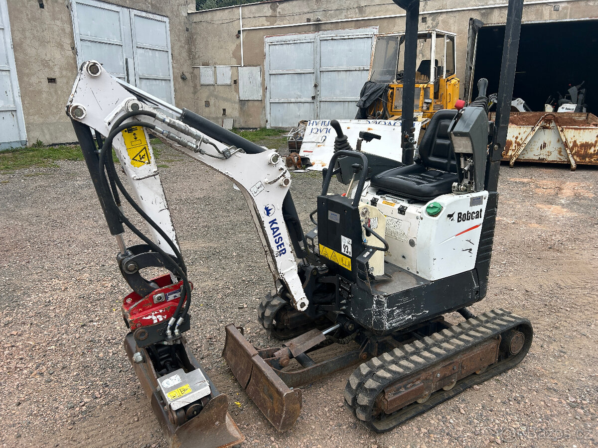 Na prodej mini bagr Bobcat E10, r.v. 2013, hmotnost ca. 1.200 kg., najeto: ca. 2.700 mth., motor Kubota 3 válec, roztahovací podvozek šířka 710/1100 mm, vývody na hydraulické kladivo, nové gumové pasy, mechanicky rychloupínač, hydraulická svahovka 800 mm, podkopovký 300 a 500