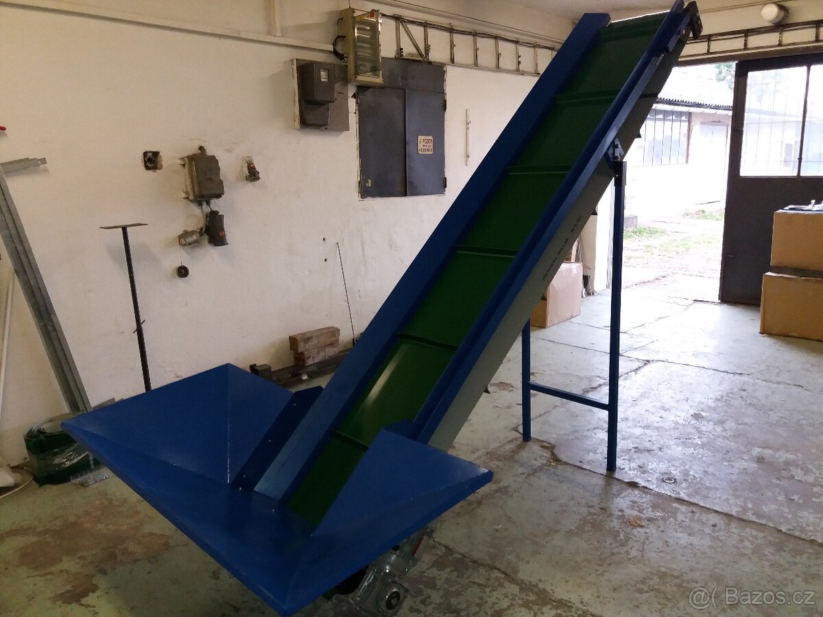 Pásový dopravník - 3 metry dlouhý, pás 25 centimetrů široký. Možno vyrobit dle konkrétního požadavku jiný, nebo upravit hřídel pro řemenici, či osadit elektromotorem (400 V i 230 V) s převodovkou, nebo hydromotorem, příp. variátorem, nebo frekvenčním měničem pro ovládání otáček. Výškově stavitelný, s násypkou, případně s postranními vlnovci. Odlehčená konstrukce pro lepší manipulaci. Vhodný pro přepravu uhlí, dřevěných špalíků, pelet, brambor, ovoce, suti, písku, štěrku, štěpky, pilin a sypkého materiálu. Možnost zaslání přepravní společností. Cena je uvedena bez pohonu z důvodu využití vícero možností zapojení.