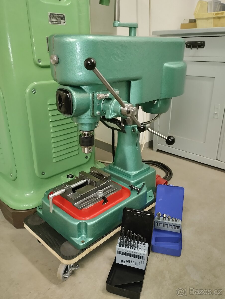 Nabízím stolní vrtačku tovární výroby Jihokov Hustopeče V13.Vrtačka má nově přefrézovaní stůl,nové led osvětlení,nový lak,řemen,nová elektrika,nová ložiska-pinola,vřeteno,motor,nové sklíčidlo 3-16mm.Kužel vřetene B16.Vřeteno běží ve 0,02mm.Čtyři stupně otáček vřetene 500,1000,1700,3000 za min.Světlost 250mm.Stav vrtačky je velmi dobrý,vše funkční.Vaha cca 90kg.