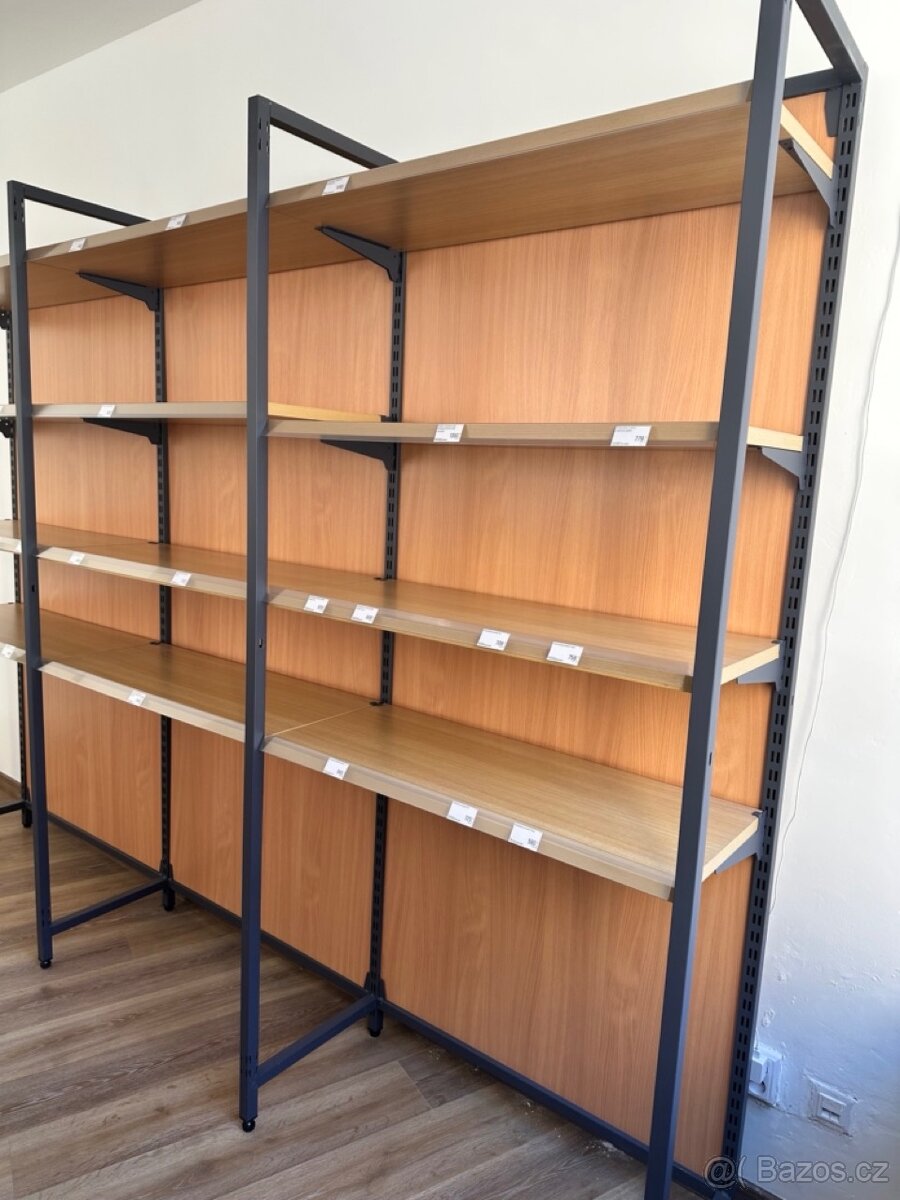 1 x velký regál 4 sekce, výška 223 cm, délka sekce 100 cm, hloubka 46 cm. Police: 97 × 40 cm.