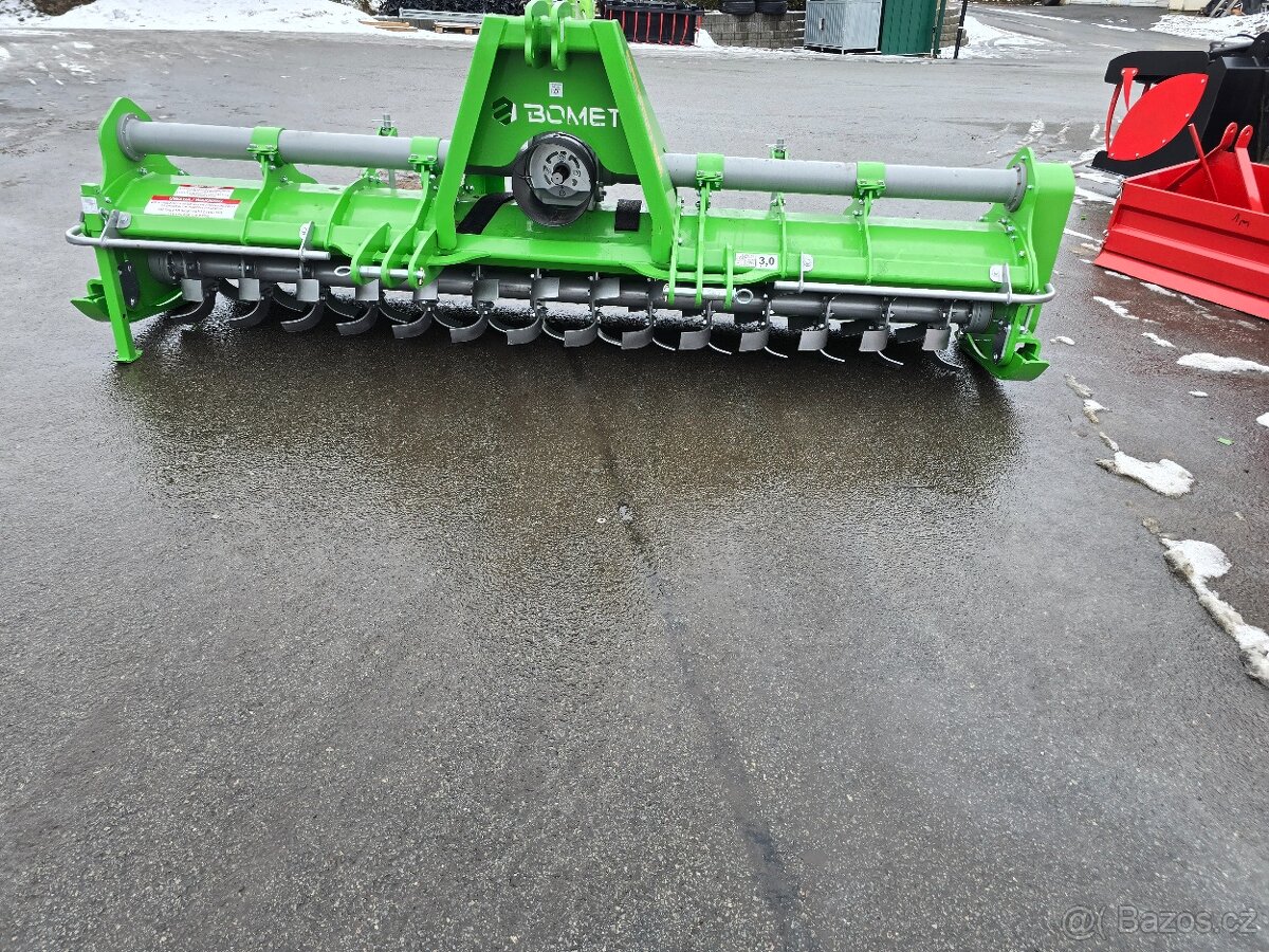 Prodám velký rotavátor Bomet Volans 300,Pracovní záběr 3m,hloubka práce lze nastavit bočními splazy do max.12cm,součástí stroje je i náhonová hřídel s přetěžovou spojkou.