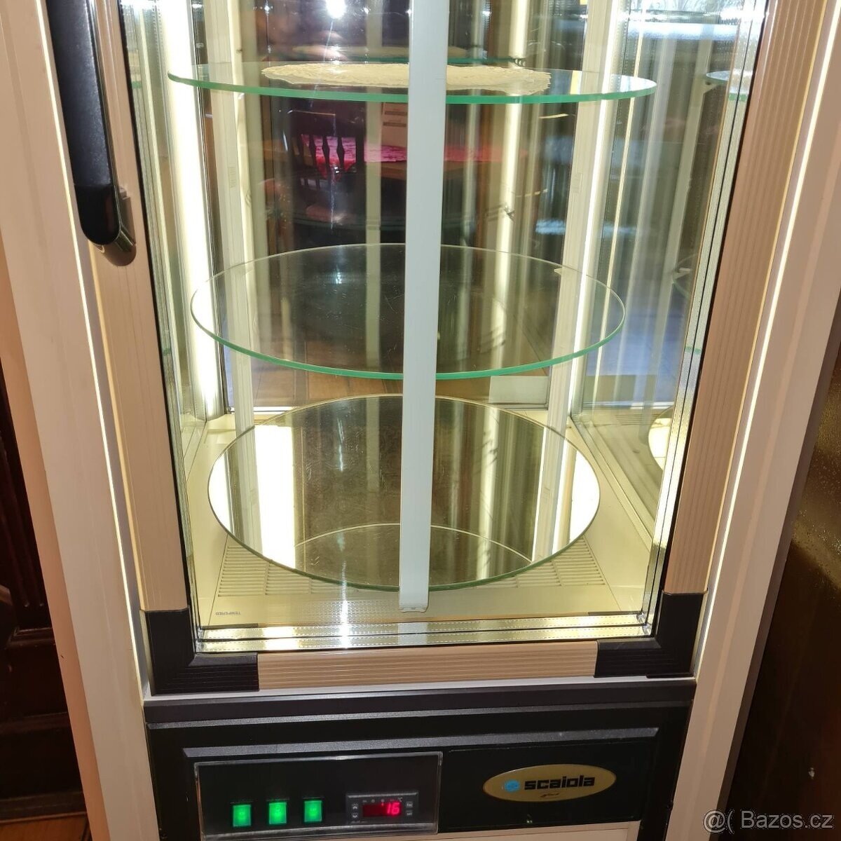 Prosklená značková chladící panoramaticka vitrína SCAIOLA ERG 400. Rozměry 70x70x183cm. Na otočném stojanu 5 skleněných polic (při otevření dveří se otáčení automaticky zastaví).
