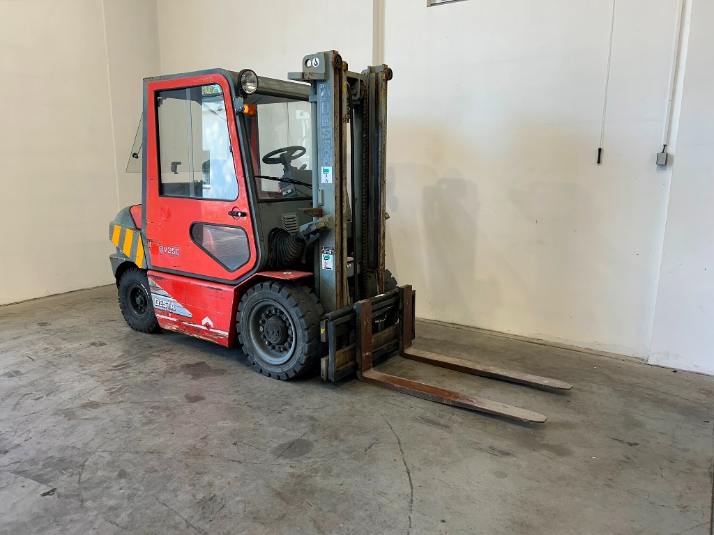 Prodávám použitý VZV DESTA DV 25 CK, vysokozdvižný čelní vozík s nosností 2500 kg a pohonem diesel. Zdvih 3300 mm, stavební výška 2150 mm, zdvihací zařízení duplex. Délka 2750 mm, šířka 1200 mm, hmotnost 4170 kg, typ pneu vzdušnicová (VZD). Rok výroby 2002, stav motohodin 3293 MTH. Výbava: boční posuv, kabina. Cena bez DPH 159 000 Kč.
