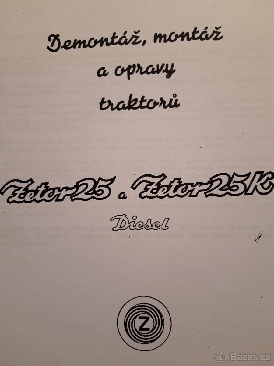 Na traktor Zetor 25, 25 A a 25 K Dílenská příručka, Katalog dílů, Návod k obsluze i jiné. Svázané kopie zakoupené na burze, ale pro práci v dílně jsou dobrými pomocníky.