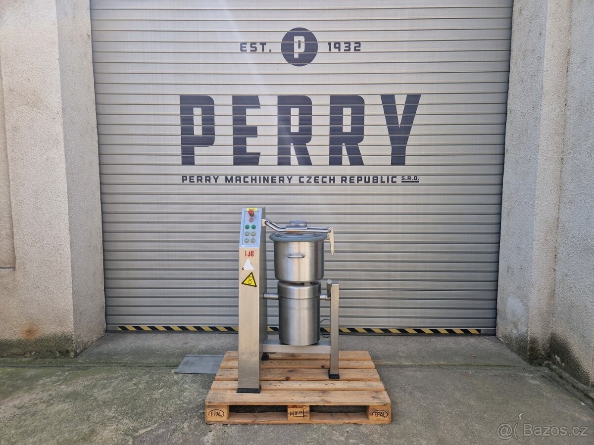 Použitý Robot Coupe Model R30 celonerezový vertikální kutr, který je určen pro velké gastronomické provozy - restaurace, výrobce uzenin, lahůdek a cukrářských výrobků s max. denní kapacitou do 500 porcí. Umožňuje zpracování masa, zeleniny a ovoce, přípravu těsta, paštik, majonéz, pyré, pomazánek a strouhanky a rovněž sekání bylinek a koření a drcení ořechů a mandlí. Vyjímatelná míchací nádoba o celkovém objemu 30 litů, pracovním objemu cca 20 litrů, má rozměry 360 mm průměr x 290 mm hloubka. Nůž s rovným ostřím (3 břity) je poháněn dvourychlostním el. motorem 4,1/5,0 kW, 1500/3000 rpm, 50 Hz, 400 V. Míchací nádoba má plastový kryt s pákovým uzavíracím systémem opatřeným bezpečnostím koncovým spínačem. Součástí je tlačítkový ovládací panel a integrovaný el. rozvaděč. Vnější rozměry: 600x720x1250 mm (výška), 130 kg gross weight.