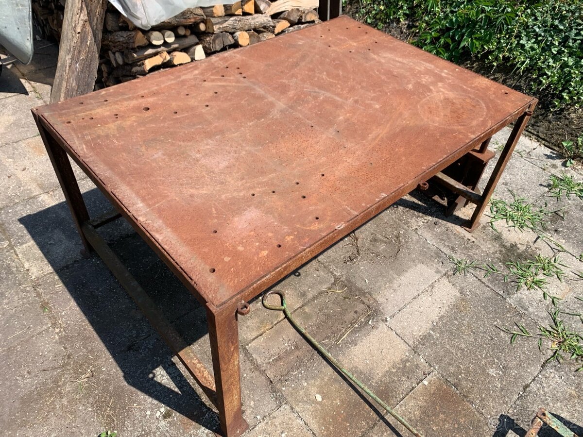 Prodám robustní železný dílenský stůl s tlustou pracovní deskou (2 cm) – ideální pro svařování, kovářské nebo zámečnické práce.