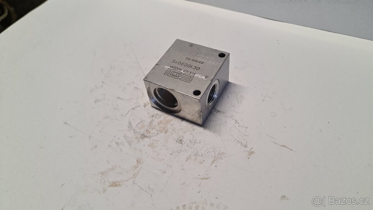 Hliníkový rozvaděč/blok ventilu od italského výrobce EDI SYSTEM MODENA, určený pro modulární stavbu hydraulických nebo pneumatických okruhů v průmyslové automatizaci, na CNC strojích nebo robotice.