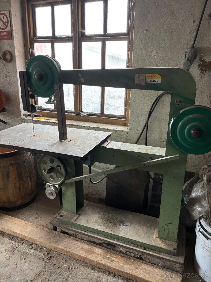 Funkční stará stojanová pásová pila v stabilním masivním provedení pro řezání primárně dřeva.