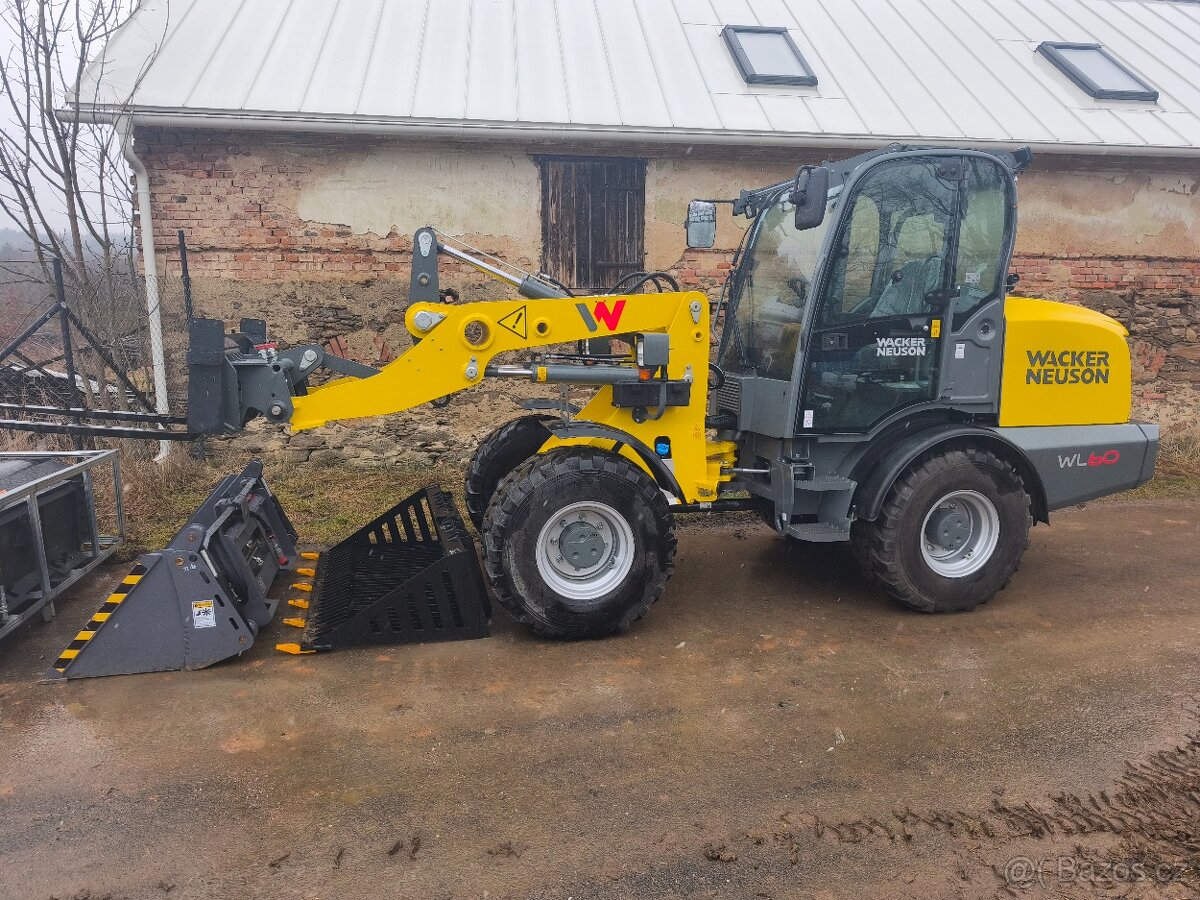 Nový kloubový kolový nakladač Wacker Neuson WL60, pouze 7 mth, rok výroby 2022, klima, radio, hydraulický rychloupínač, motor Perkins 74,4kw, paletizační vidle, hydraulická lopata 4v1, roštová lopata, vibrační válec o hmotnosti 1000kg, rotavator. Cena za komplet včetně uvedeného příslušenství je 1.555.000 bez dph.