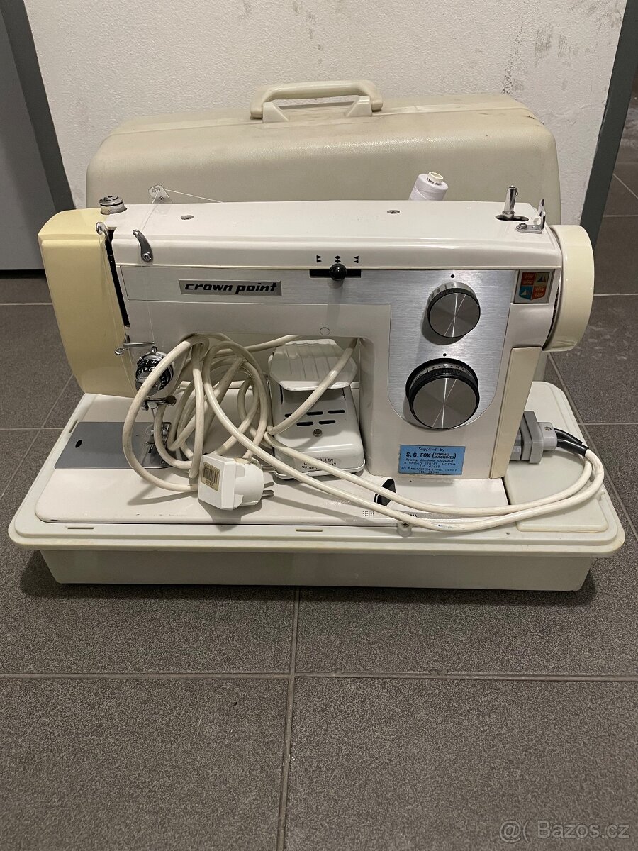 kufříkový šicí stroj značky Crown Point, pravděpodobně vyrobený v Japonsku. Tento model je určen pro základní i pokročilejší domácí šití a disponuje funkcemi pro rovný steh a cik-cak steh.