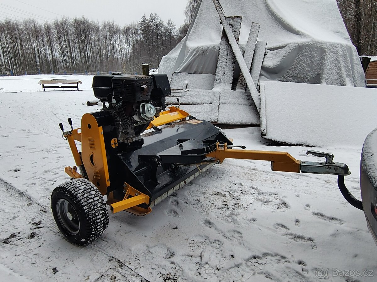 Motorový Mulčovač za čtyřkolku CRONIMO BCQ-120 je určen na mulčování větších ploch. Robusní a pevná konstrukce. Nyní vylepšeno o agregovatelné kola, které lze mít buď postranách stroje (pro stabilní práci) nebo otočit a přesunout za mulčovač, čímž lze mulčovat bliže překážce (ploty, stromy). Na obou stránách lze nyní také samostatně měnit výšku sečení Dále má mulčovač nově také otvírací čelo pro snadnější údržbu stroje. Mulčovač při sekání drtí vegetaci - porost na drobné kousky, které se nechávají na posečené ploše a slouží jako hnojivo. Kladívkové mulčovače CRONIMO jsou vynikající nástroj pro rekultivaci zarostlých divokých ploch, velkých travnatých ploch, mulčování pastvin, atd. Skvěle však poslouží také jako mulčovač na mulčování zahrady. Nastavení výšky sekání od 20 do 200 mm, Připojení k jakémukoliv tažnému zařízení s koulí o průměru 50 mm. Samozřejmostí jsou zadní ochrané rámy pro zajištění bezpečnosti při sekání. Připojení přes tažné zařízení-kouli standartních evropských rozměrů. Možnost výměny Y nožů za kladiva, podle typu sekaného porostu. Hmotnost 235kg .