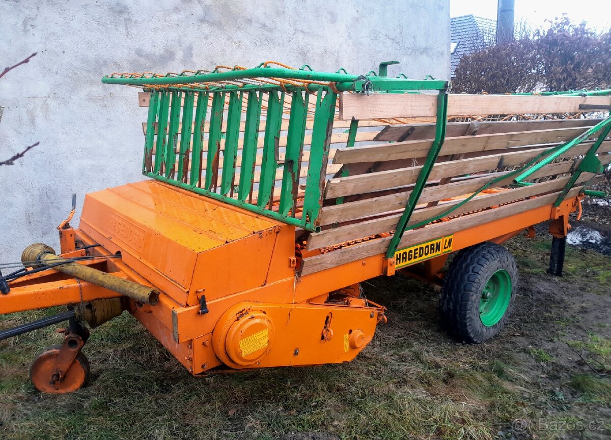 Samosběrací vůz Hagedorn pro traktor, malotraktor cca od 12 PS. Funkční mechanická brzda, elektroinstalace, náhonový hřidel. Málo používaný, garážovaný, v bezv. stavu.