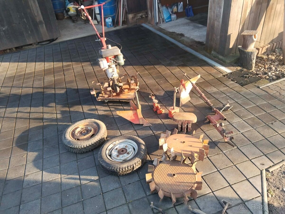 Prodám sestavu Vary, je tam rotavator a tři stupňová prevodovka, rádlo na brambory, ruchadlo na oraní, kompletní zavazi, orná kola, kola na silnici, motor s lehkým startem, dekomprese