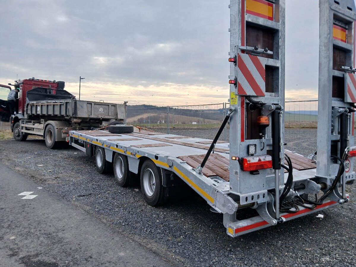 Přívěs na kompresor, vrtná souprava, harvestor, bagr, - [27.2. 2026]Přívěs na finišer,válec, bagry,jinou techniku, celková hmotnost až 40000 kg,užitečné zatížení až 29000 kg,délka ložné plochy až 9200 mm,v celé délce rovná ložná plocha,hydraulické nájezdy s posuvem do stran, nájezdový úhel 12 stupňů, celožárově zinko ...