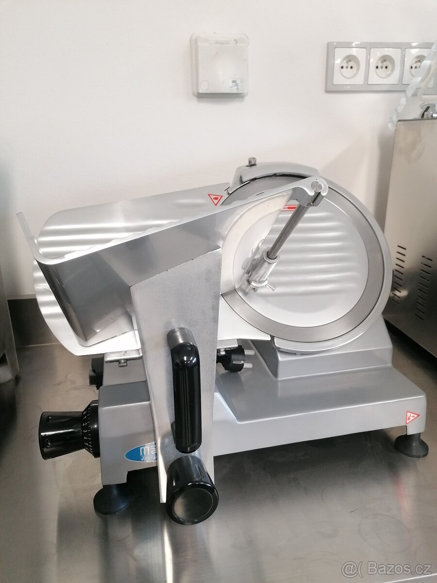 Profesionální nářezový stroj (slicer) značky Maxima určený pro krájení masa, uzenin, sýrů a dalších potravin na přesné plátky. Ideální pro restaurace, řeznictví i gastro provozy. Umožňuje nastavení tloušťky řezu a zajišťuje rychlou a rovnoměrnou práci.