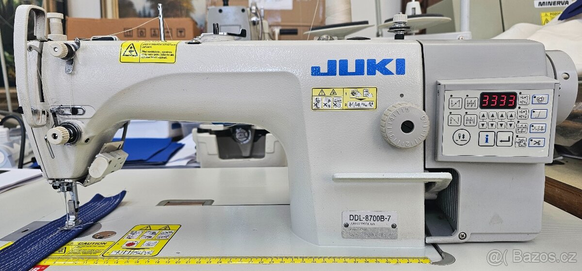 Šicí stroj JUKI DDL 8700 B-7.Spodní ponorný posun šitého materiálu. Vhodný pro šití tenkých, středních i silnějších materiálů.Málo používaný pro domácí šití.Plný automat, automatický odstřih nití, zvedání patky a zapošití. Programování šití a zapošití atd.Tichý a energeticky úsporný servomotor JUKI 220V v hlavě stroje.Nastavení rychlosti šití a pozicionér jehly. Seřízený, zašitý a plně funkční. Návod, popis, katalog náhradních dílů, jehly, navlékač, cívky, olej, doklad atd.Osobní převzetí a vyzkoušení.Po dohodě dovezu