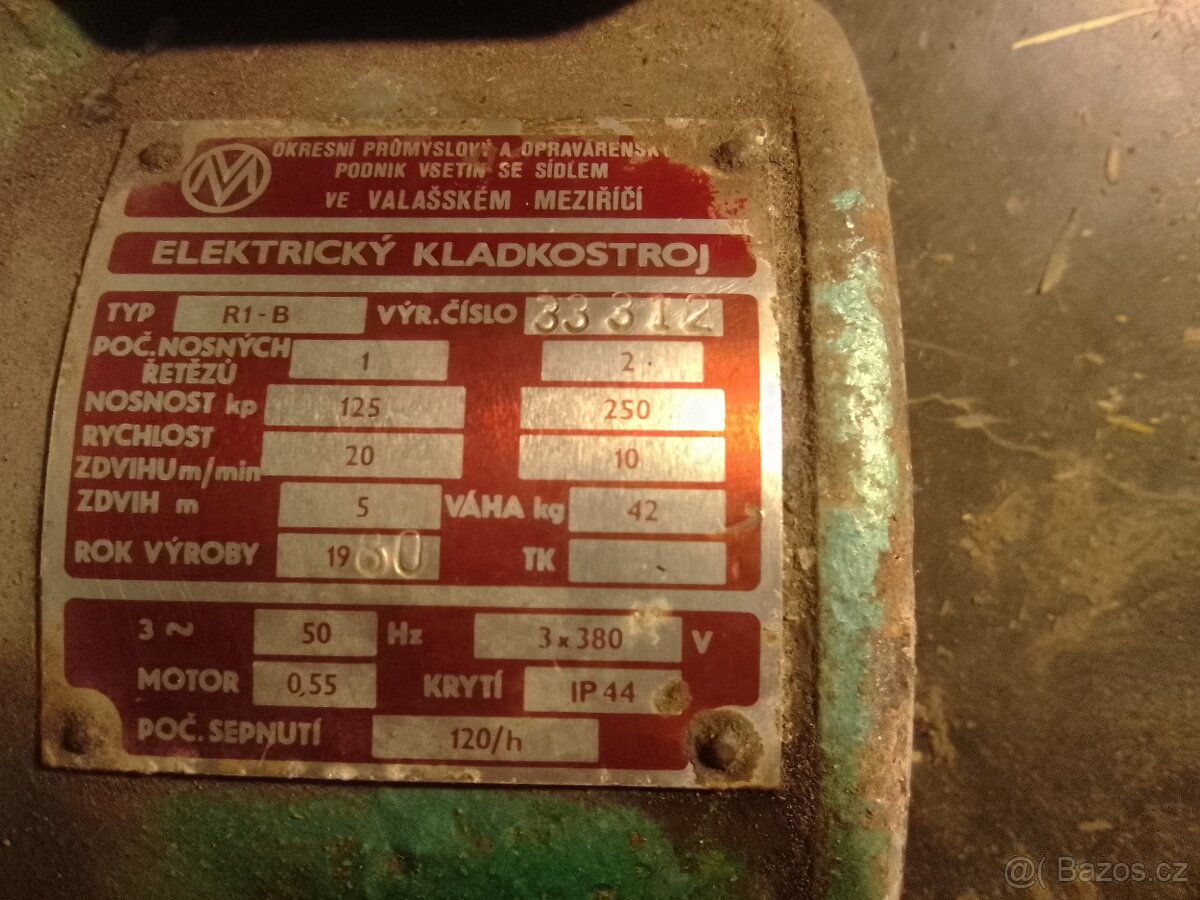 Prodám elektrický kladkostroj řetězový s motorem mez. nosnost 250kg.cena 3000kč tel.737717263