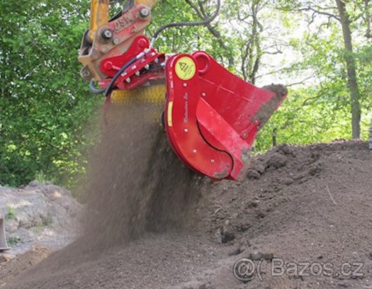 Rotující hřídele s hvězdicemi materiál nuceným způsobem třídí. Na rypadla 2-25 tun, 8 velikostí, verze i na nakladače, robustní, výkonné zařízení. Referenční kusy v ČR.