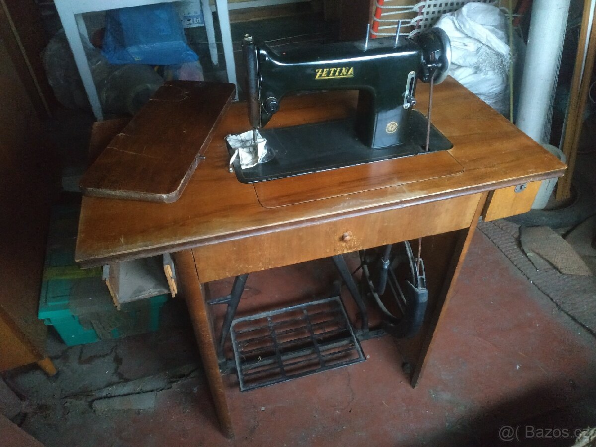 Nabízím starý funkční šicí stroj Zetina Brno. Krycí deska poškozená, chybí jedno čílko šuplíku. Prostě skříňka odpovídá stáří. Stroj je pěkný, zachovalý. Cena 500,- Kč.