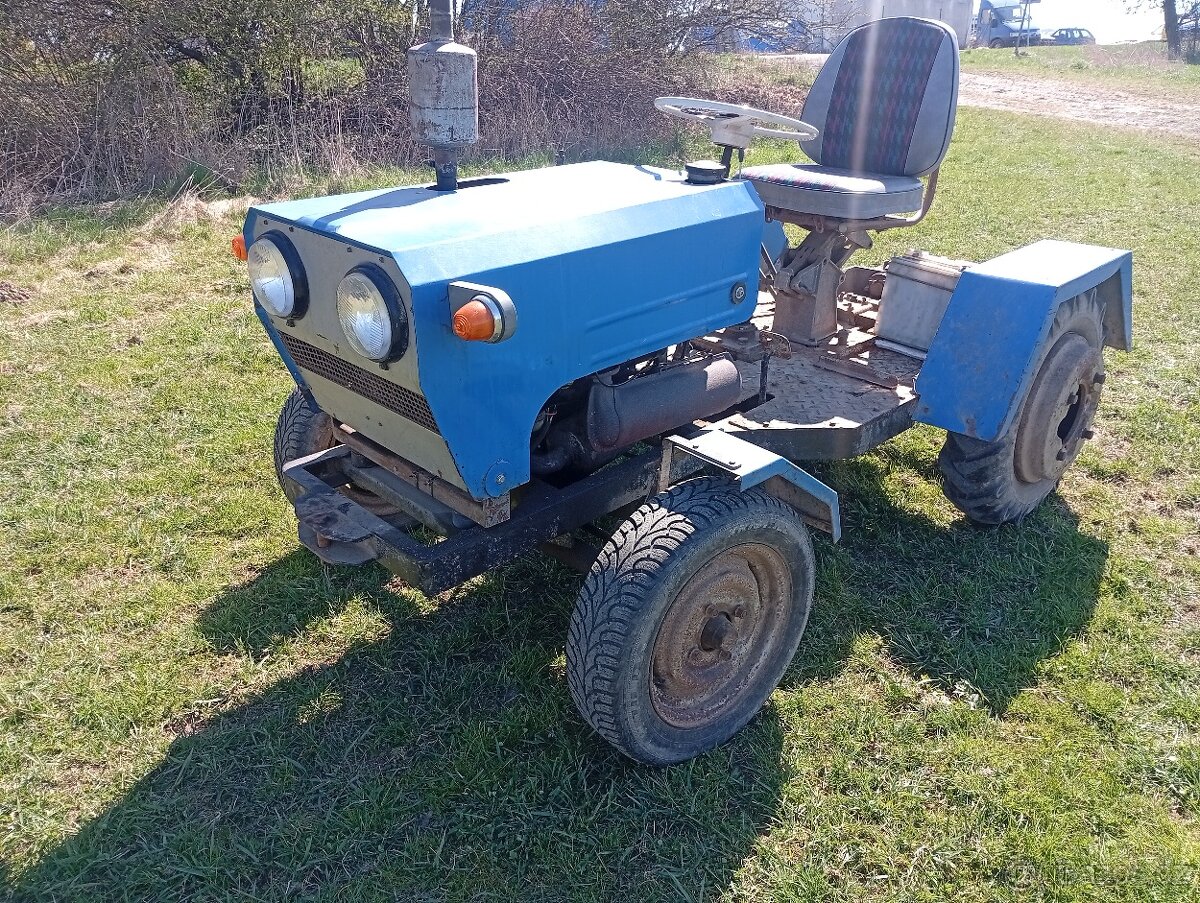 Traktůrek s motorem z Trabantu. Motor chodí hezky, nová kladívka a kondenzátory. Originál převodovka trabant, druhá do rychla nebo do pomala, další na zpátečku, uzávěrka diferenciálu. Traktor celkově hezky zpracovaný.